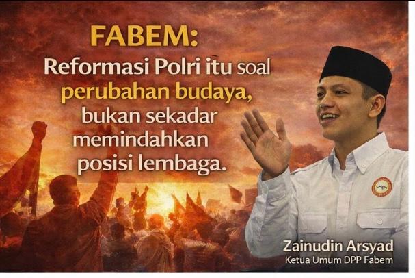Lebih lanjut, FABEM mengingatkan bahwa semangat Reformasi 1998 adalah membangun institusi negara yang profesional dan demokratis, bukan sekadar melakukan reposisi struktural. Oleh karena itu, wacana yang berkembang saat ini harus dikembalikan pada tujuan awal reformasi, yakni menciptakan kepolisian yang modern, berintegritas, dan berorientasi pada perlindungan masyarakat.